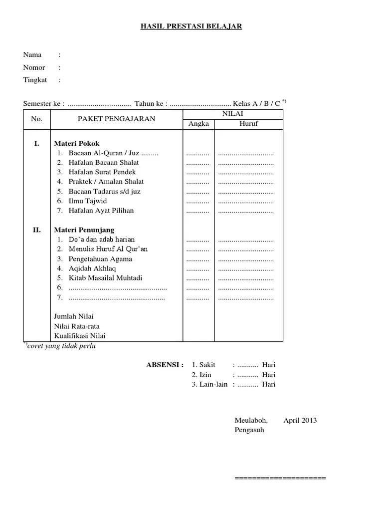 Format raport tpq taman pendidikan al quran pontren com. Download aplikasi raport kurikulum 2013 raport k13 untuk sma sesuai permendikbud 23 tahun 2016 revisi 2017 aplikasi r in 2021 microsoft . Solusi wa 0822 3161 2453 contoh raport tpq jepara jual sampul rapot . Siswa a memperoleh nilai ulangan harian dan tugas dengan . Bertugas melakukan kegiatan belajar mengajar dan bertanggungjawab terhadap raport masing masing santri di kelas tempat diserahi tugas.