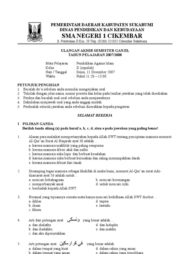 Contoh soal agama islam kelas 10 sma/ma/smk semester 1 & 2 pg dan . Contoh soal pai sma pilihan ganda dan kunci jawabannya kelas x. 80 contoh soal uas pai kelas 10 sma ma dan kunci jawabnya. Net soal agama islam kelas 6 semester 1 dan kunci jawaban kurikulum. Pada kesempatan kali ini kakak telah menyiapkan bebebrapa soal untuk adik adik yang sedang duduk dibangku kelas 10 sma/ma pada pembahasan semester pertama, soal .